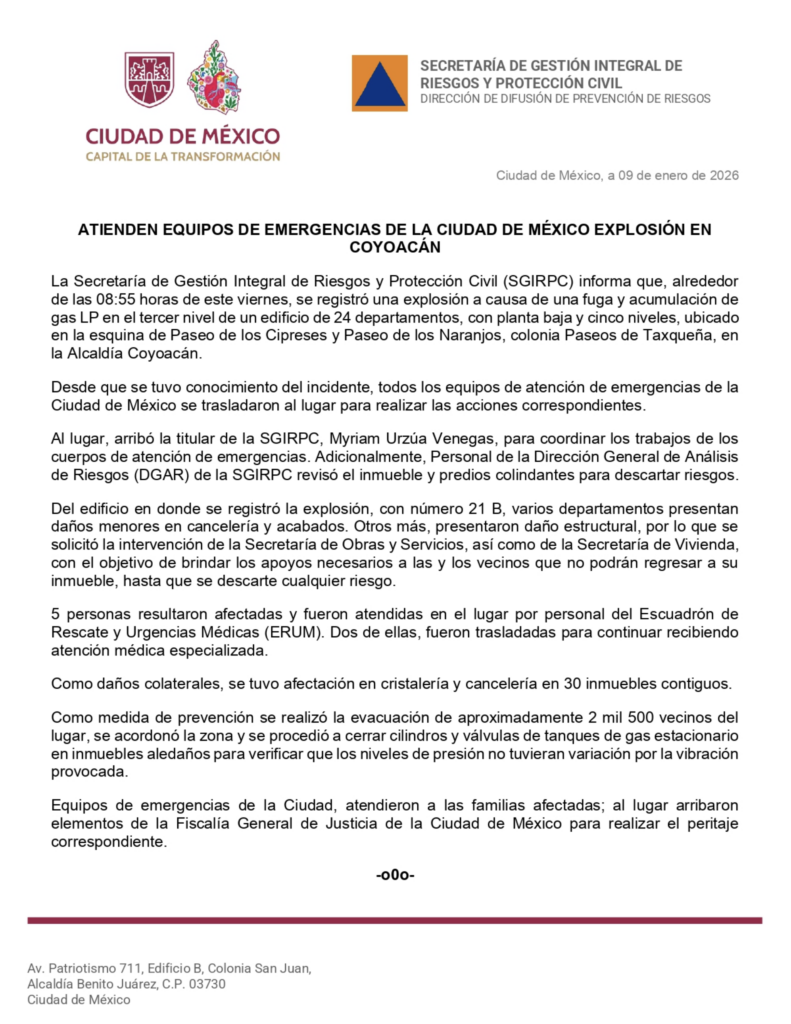 La mañana de este viernes, una explosión en una casa habitación de la colonia Paseos de Taxqueña, en la alcaldía Coyoacán, provocó una intensa movilización de cuerpos de emergencia y la evacuación de habitantes del lugar. El incidente ocurrió en el cruce de Paseo de los Cipreses y Paseo del Río, y de manera preliminar se atribuye a una acumulación de gas LP al interior de un inmueble habitacional.